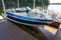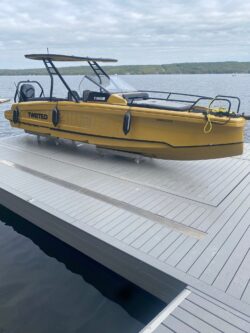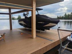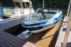 A unique boat lift design uses hydraulic power that is hidden under the decking to lift boats ranging in size from a personal watercraft up to 10,000 lb. quietly and faster than conventional Wet Slip lifts. Synchronized cylinders lift the cradle with the push of a button by remote control. The hydraulic power pack is an AC Unit which includes limit switches to ensure both sides are kept level. Also, in some cases a decked platform can also be added to cover the cradle for the ultimate custom lift.