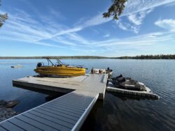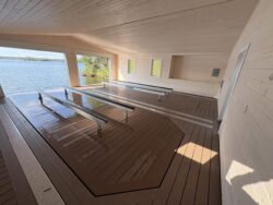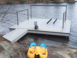 R&J Machine manufactured Commercial Floating Dock system includes a Hidden Wet Slip Lift with Roof, Tapered Ramp leading out from an Aluminum Truss Pipe Dock, and Wave Ports