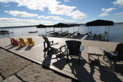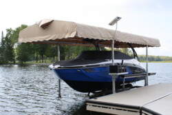 The hydraulic system will quietly and quickly remove your boat from the water. All pivot points on the bed have bronze bushings and stainless steel lift pins. Our hydraulic cylinders are filled with biodegradeable fluid to protect the environment should a seal or hydraulic line ever fail. Our hydraulic rams are specially coated to provide long life in a harsh marine environment. We use special double lip seals to keep water out while keeping the hydraulic fluid in. Our up and down movement is controlled by a push button remote control. The entire system runs by a 12 volt battery. A solar panel on the top of the dock helps to keep your battery charged.