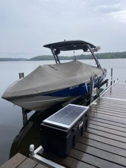 The lift includes a DC hydraulic pump and a remote control that is mounted in a dock box for easy access. Additionally, a 12-volt deep cycle battery is included for power supply, providing convenience and reliability.