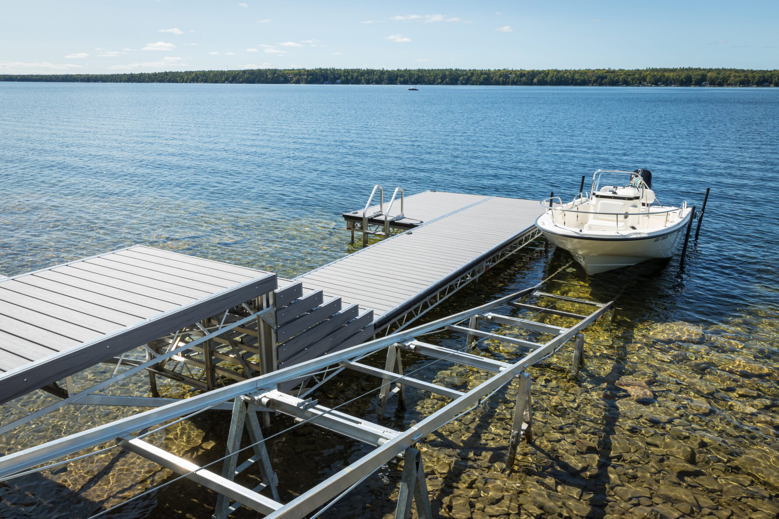 The wheels are flanged steel casters, designed for marine railway use, with grease fittings and brass bearings, supported front and back by twin support beams. Guide hooks keep the carriage from becoming derailed when loading during windy conditions. Your boat can safely come within inches of your dock for easy boarding.